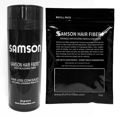 1 . ยี่ห้อ SAMSON HAIR FIBER ตัวนี้เป็นผงไฟเบอร์ที่ได้รับความนิยมมากที่สุดของร้าน เพราะเป็นผงใส่ผมที่มีคุณภาพดีมาก แต่ราคาไม่แรงตามคุณภาพ ตัวผงไฟเบอร์ของ samson นำเข้ามาจากประเทศอเมริกา แต่มีการนำมาเพิ่มกระบวนการที่ทำให้ตัวผงใส่ผมเกิดไฟฟ้าสถิตย์ได้ที่ประเทศไทย และก็บรรจุในประเทศไทย ซึ่งตัว samson hair fiber ได้มีการจำหน่ายในประเทศไทยได้ประมาณ 8 ปีแล้วครับ ยังไม่มีผู้ที่ใช้งานแล้วเกิดอาการแพ้ มีเลขจดแจ้ง อย 10-2-6100056592 จึงทำให้ samson hair fiber นั้นเป็นลูกผสมระหว่างไทยและอเมริกา